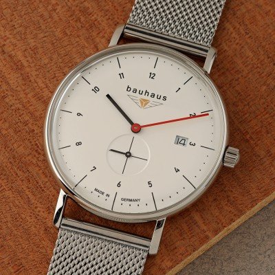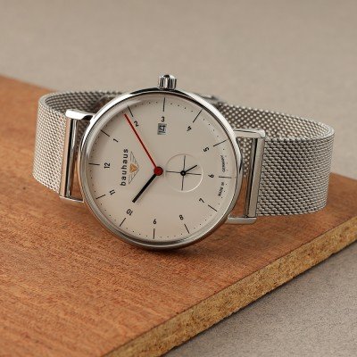Cette montre Bauhaus a un boîtier Inox 41 mm en diamètre et est équipée d'un bracelet Inox. Le boîtier contient un mouvement Ronda et la montre est dotée d'un cristal K1 Minéral..