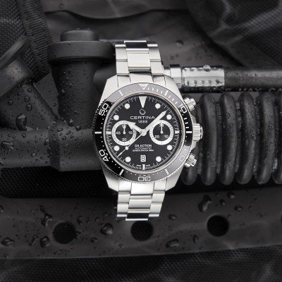 La DS Action Diver Chrono combine les caractéristiques de plongée de la DS Action Diver avec une fonction chronographe. Comme toutes les autres montres Certina portant le nom DS, elle est extrêmement résistante à l'eau, en l'occurrence jusqu'à 300 mètres (conformément à la norme ISO 6425 relative aux montres de plongée). La dernière-née de la série DS Action se compose de trois montres : un modèle à cadran bleu et noir avec un bracelet en acier inoxydable, et un modèle à cadran couleur sable avec des accents noirs et dorés et un bracelet assorti en plastique recyclé (matériau de l'océan #tide). Le design de la montre s'inspire en partie de la DS Action Diver de 43 mm et de certains éléments du chronographe DS-2, avec ses protège-couronnes massifs et sa lunette unidirectionnelle de 60 minutes avec insert en céramique. Le boîtier robuste de la DS présente une finition brossée sportive avec des touches polies sur la couronne, les poussoirs et, bien sûr, le fond du boîtier avec le logo de la tortue. Bien que la Certina DS Action Diver Chrono soit redevable aux montres-outils des années 1950 de la marque, ses accents rétro sont réduits au minimum avec des compteurs symétriques alignés horizontalement et un cadran de petite seconde à 9 heures. La DS Action Diver Chrono est animée par un mouvement chronographe automatique ETA A05.231 doté d'un ressort en silicium antimagnétique et d'une réserve de marche de 68 heures, ce qui en fait non seulement un chronographe de plongée fonctionnel, mais aussi un compagnon élégant.