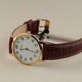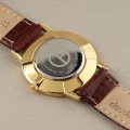 Montre retournée présentant de petites rayures au dos et des dommages sur le dessus du bracelet en cuir (au niveau de la boucle).