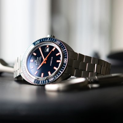 Cette Edox Hydro-Sub est une édition spéciale limitée à 500 exemplaires. Elle est étanche jusqu'à 30 ATM et est animée par un mouvement automatique Edox Calibre 806 basé sur le Sellita SW200 et certifié COSC. Son design classique est rehaussé par la subtile lunette en céramique et les aiguilles et index lumineux proéminents.