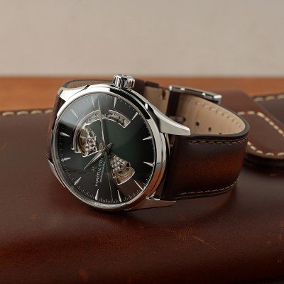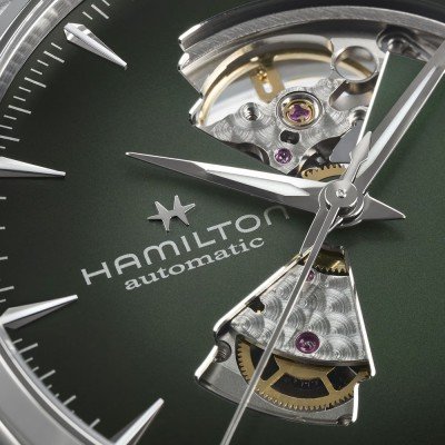 La Hamilton Jazzmaster Viewmatic équilibre parfaitement le formel et le sport en combinant un boîtier magnifiquement fini avec un mélange de surfaces polies et brossées et un cadran à cœur ouvert intrigant affichant les éléments mécaniques qui battent en dessous. Les découpes superbement exécutées dans le cadran ont une lunette très polie passant brusquement à un bord intérieur brossé, dirigeant l'œil vers le mouvement automatique H-10. Ce mouvement Hamilton très précis contient un spiral Nivachron non magnétique et dispose d'une réserve de marche de pas moins de 80 heures. La Jazzmaster Viewmatic Open Heart Auto est disponible dans une gamme de couleurs et dans des tailles de boîtier de 40 mm et 36 mm, pour hommes et femmes.