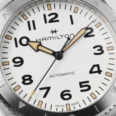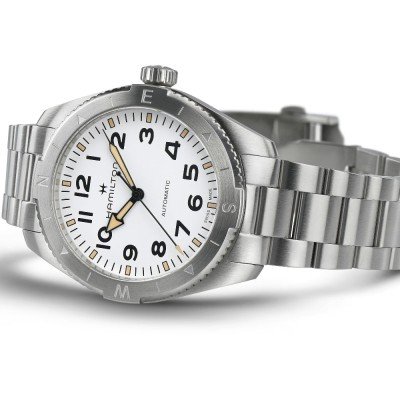 Cette montre Hamilton a un boîtier Inox 41 mm en diamètre et est équipée d'un bracelet Inox. Le boîtier contient un mouvement ETA et la montre est dotée d'un cristal Saphire..