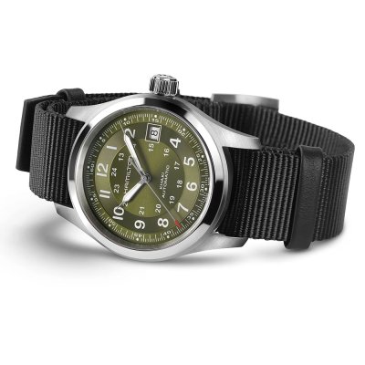 Cette montre Hamilton a un boîtier Inox 38 mm en diamètre et est équipée d'un bracelet Textile. Le boîtier contient un mouvement ETA et la montre est dotée d'un cristal Saphire..