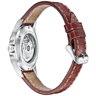 Cette montre Hamilton a un boîtier Inox 40 mm en diamètre et est équipée d'un bracelet cuir. Le boîtier contient un mouvement ETA et la montre est dotée d'un cristal Saphire..
