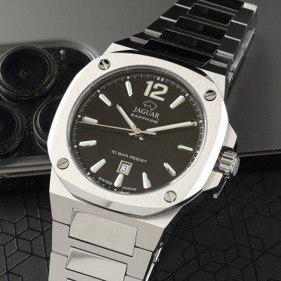 Cette montre Jaguar a un boîtier Inox 41 mm en diamètre et est équipée d'un bracelet Inox. Le boîtier contient un mouvement Ronda et la montre est dotée d'un cristal Saphire..