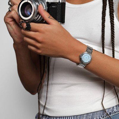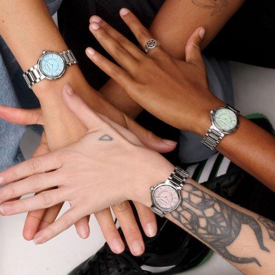 Les trois montres Fiaba - édition couleur pour femmes ont été développées en collaboration avec trois femmes extraordinaires : l'athlète britannique Hannah Lucy Williams, la longboardeuse Marina Correira et l'artiste Nadia. Leur mode de vie actif a inspiré Maurice Lacroix pour la création de ces montres distinctives aux teintes fraîches et vibrantes. Les montres de 32 mm sont à la fois élégantes et cool, avec des aiguilles des heures et des minutes en forme de feuille, une aiguille centrale des secondes légère, des index en forme de larme ou un chiffre arabe, sauf à 12 heures où le logo M de la marque indique l'heure de minuit. La zone centrale du cadran est encadrée d'un cercle de 46 diamants SI (0,1242 carats au total), ce qui ajoute une touche de glamour. Cette nouvelle Fiaba Trio est disponible dans un choix de trois teintes de cadran : Baby Blue, Blush Pink et Pistachio Green.