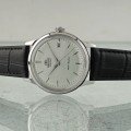 Cette montre Orient a un boîtier Inox 38 mm en diamètre et est équipée d'un bracelet cuir.