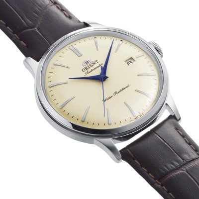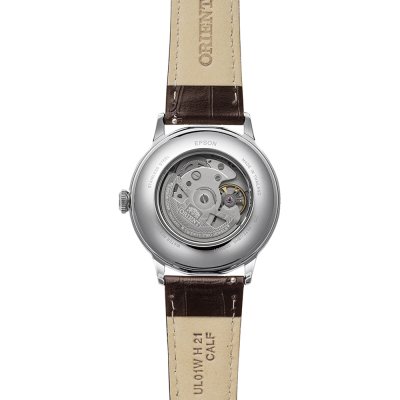 Cette montre Orient a un boîtier Inox 40 mm en diamètre et est équipée d'un bracelet cuir. Le boîtier contient un mouvement Orient et la montre est dotée d'un cristal Minéral..