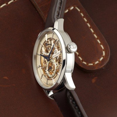 Une montre squelette vraiment belle commence par le degré de détail du mouvement squelette, et cette Orient M45 Pleiades est à la hauteur. Le mouvement à remontage manuel de la série 46-F8 dispose d'une réserve de marche de 70 heures. Le guillochage est complexe et la roue d'échappement est teintée d'un bleu saisissant grâce à la technologie MEMS d'Epson, qui permet de contrôler l'épaisseur du film au niveau du nanomètre. La forme unique de la spirale évoque la Voie lactée, et la partie du mouvement située à neuf heures, en forme de comète à deux queues, symbolise le thème du design inspiré de l'univers de la M45.