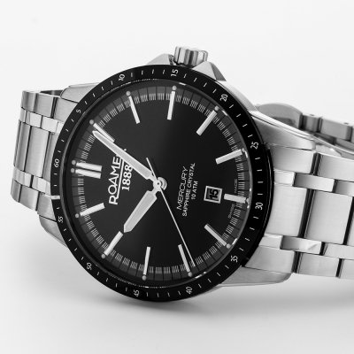 Cette montre Roamer a un boîtier Inox 42 mm en diamètre et est équipée d'un bracelet Inox. Le boîtier contient un mouvement Ronda et la montre est dotée d'un cristal Saphire..