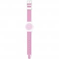 Ce bracelet de montre Swatchest fait de silicone et est attaché à la montre au moyen de goupilles en acier. Le bracelet a une taille de 17 mm et se ferme au moyen d'un boucle. Le bracelet n'a pas de support droit, ce qui signifie que ce bracelet convient uniquement aux montres énumérées ci-dessous.
