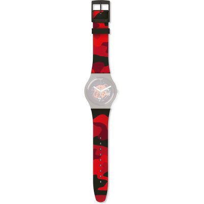 Ce bracelet de montre Swatchest fait de silicone et est attaché à la montre au moyen de goupilles en acier. Le bracelet a une taille de 19.7 mm et se ferme au moyen d'un boucle. Le bracelet n'a pas de support droit, ce qui signifie que ce bracelet convient uniquement aux montres énumérées ci-dessous.