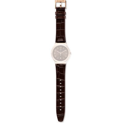 Ce bracelet de montre Swatchest fait de cuir et est attaché à la montre au moyen de goupilles en acier. Le bracelet a une taille de 18.9 mm et se ferme au moyen d'un boucle. Le bracelet n'a pas de support droit, ce qui signifie que ce bracelet convient uniquement aux montres énumérées ci-dessous.
