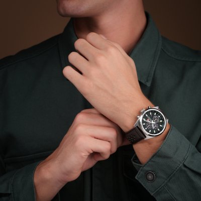 Cette montre Swiss Military Hanowa a un boîtier Inox 43 mm en diamètre et est équipée d'un bracelet cuir. Le boîtier contient un mouvement Ronda et la montre est dotée d'un cristal Saphire..