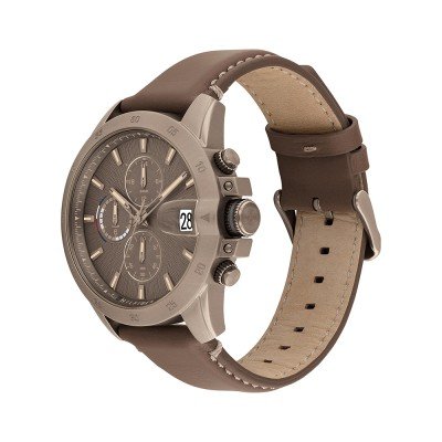 Cette montre Tommy Hilfiger a un boîtier Inox 43 mm en diamètre et est équipée d'un bracelet cuir. Le boîtier contient un mouvement Seiko Instruments Inc. et la montre est dotée d'un cristal Minéral..
